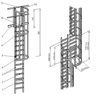 I materiali e le dimensioni degli elementi costitutivi della scala sono stati costruiti secondo UNI EN ISO 14122-4:2005 e seguendo le modalità costruttive definite della norma stessa.